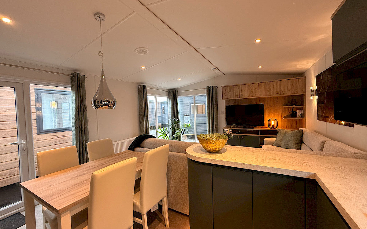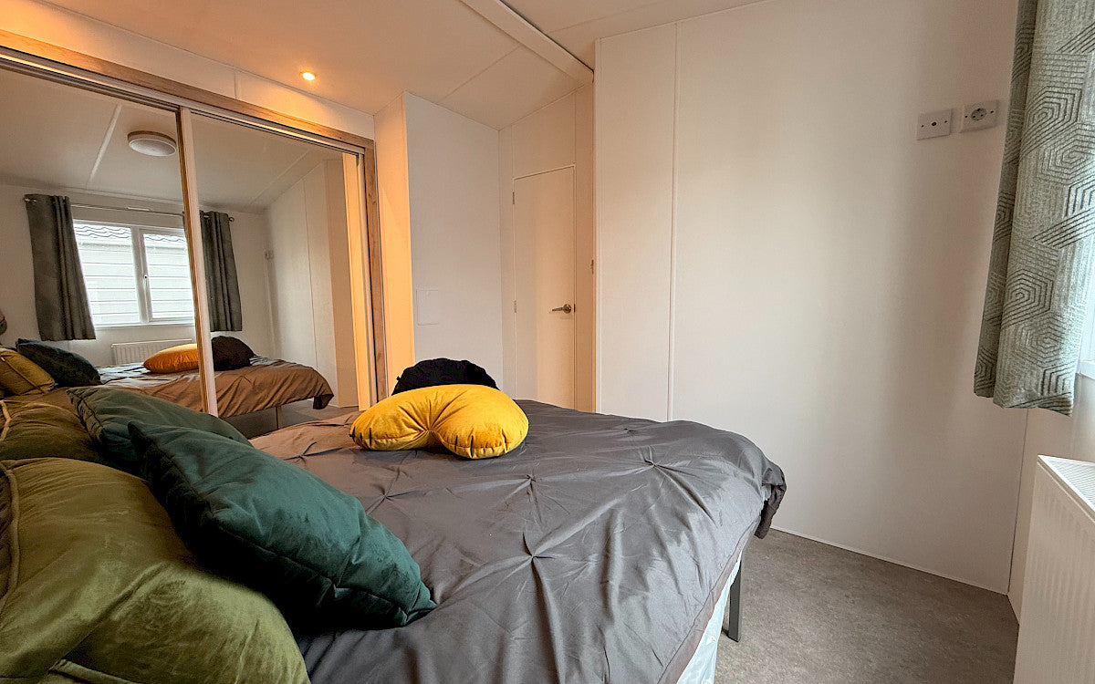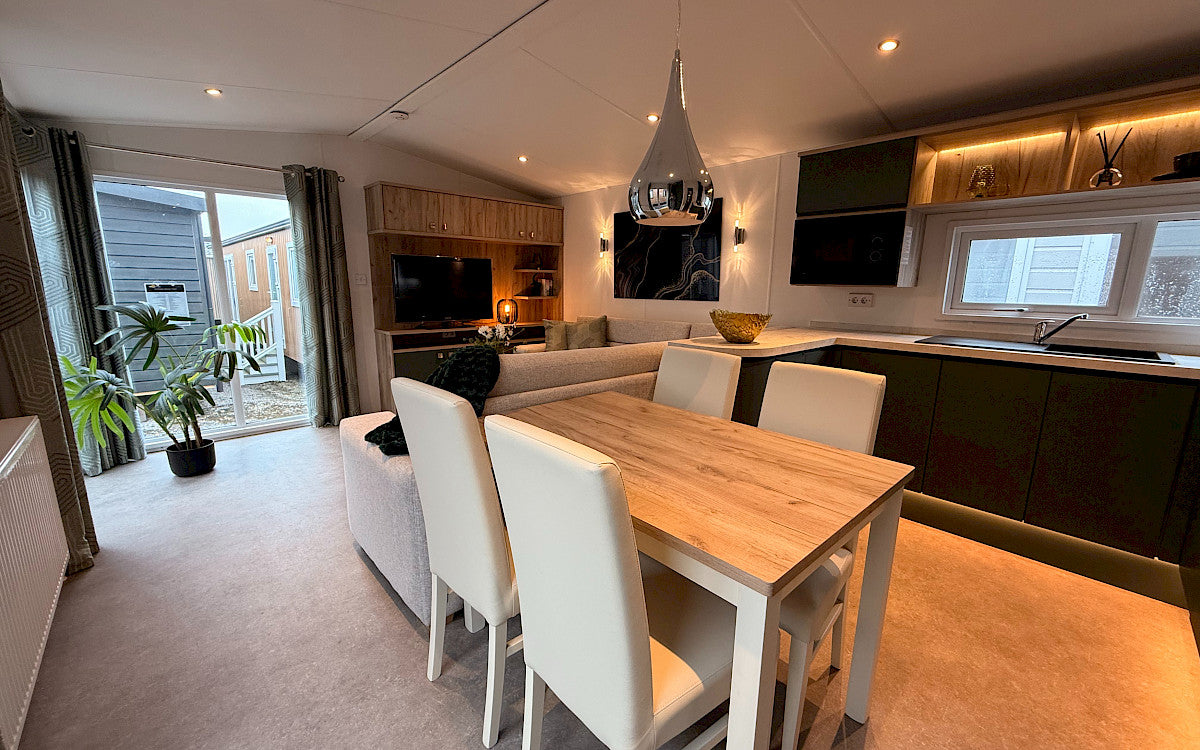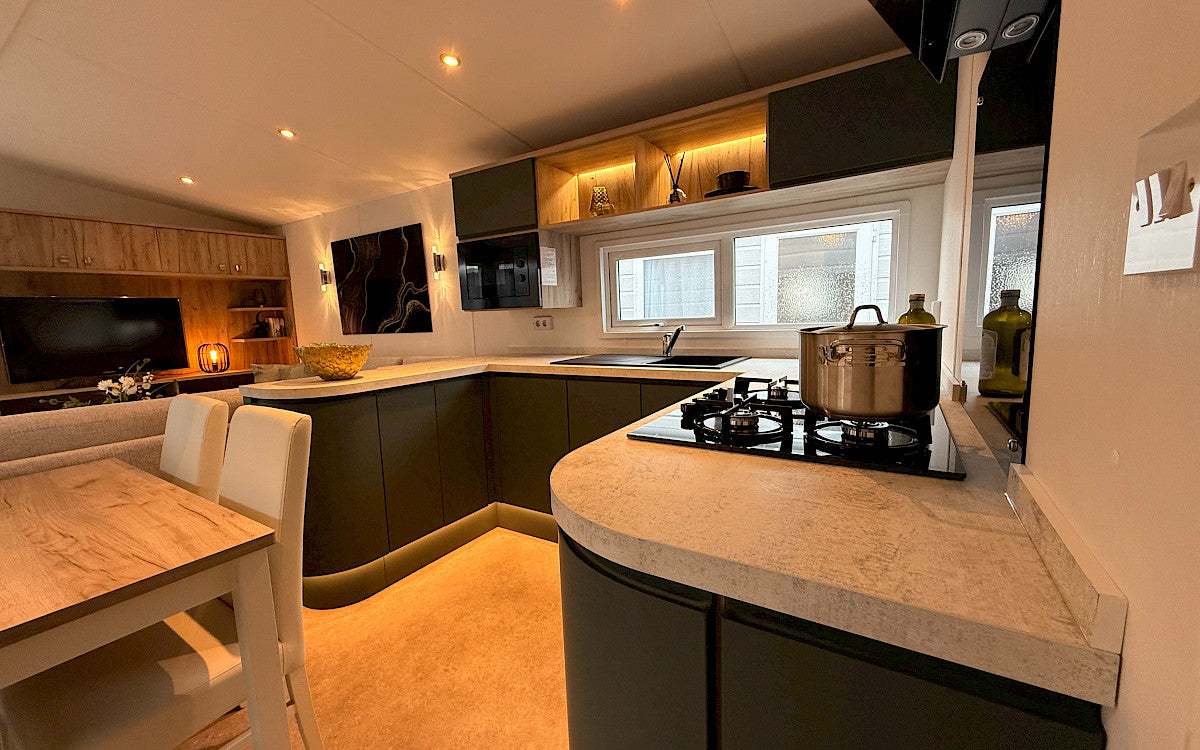 The special Bergjes Atlantis series is a beautiful addition to our range. This model features a light gray exterior with anthracite frames. The kitchen is elegant, dark green and equipped with an LED strip! The large corner sofa is perfect for cozy evenings with friends or family. Large corner windows provide beautiful views of the holiday park. The living area is separated from the bedroom, bathroom, and separate toilet by a connecting door. In short, the perfect holiday home! Interested? Come and see this model in our showroom.