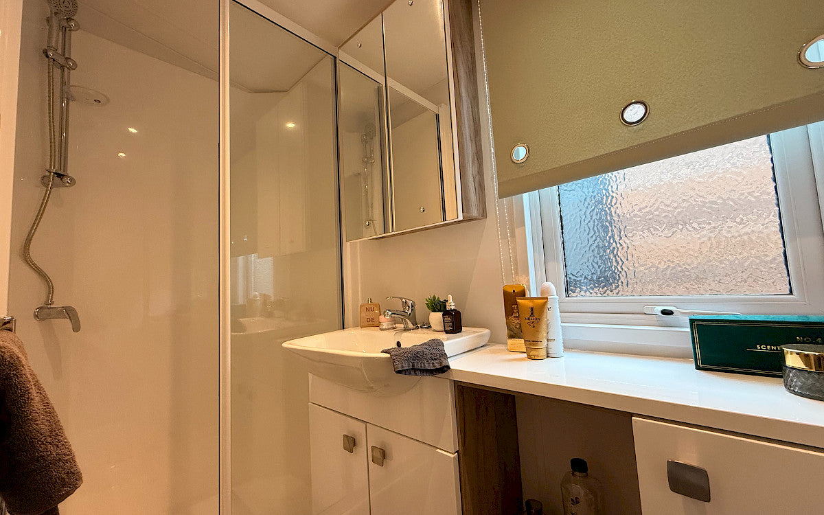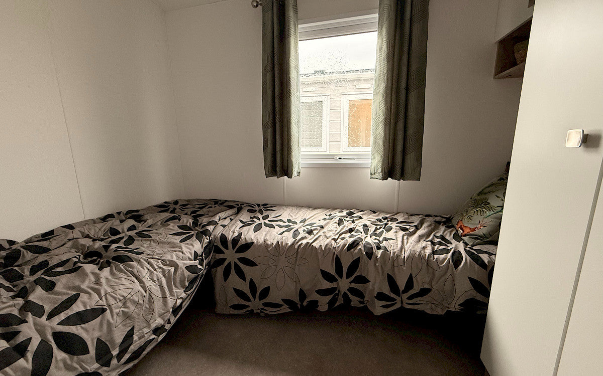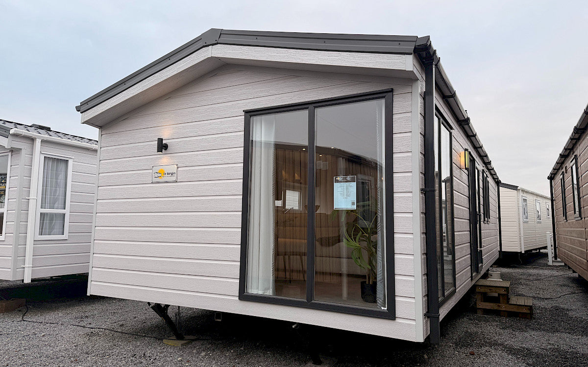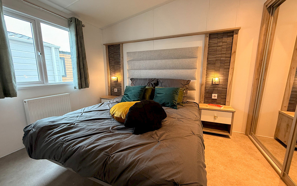 The special Bergjes Atlantis series is a beautiful addition to our range. This model features a light gray exterior with anthracite frames. The kitchen is elegant, dark green and equipped with an LED strip! The large corner sofa is perfect for cozy evenings with friends or family. Large corner windows provide beautiful views of the holiday park. The living area is separated from the bedroom, bathroom, and separate toilet by a connecting door. In short, the perfect holiday home! Interested? Come and see this model in our showroom.