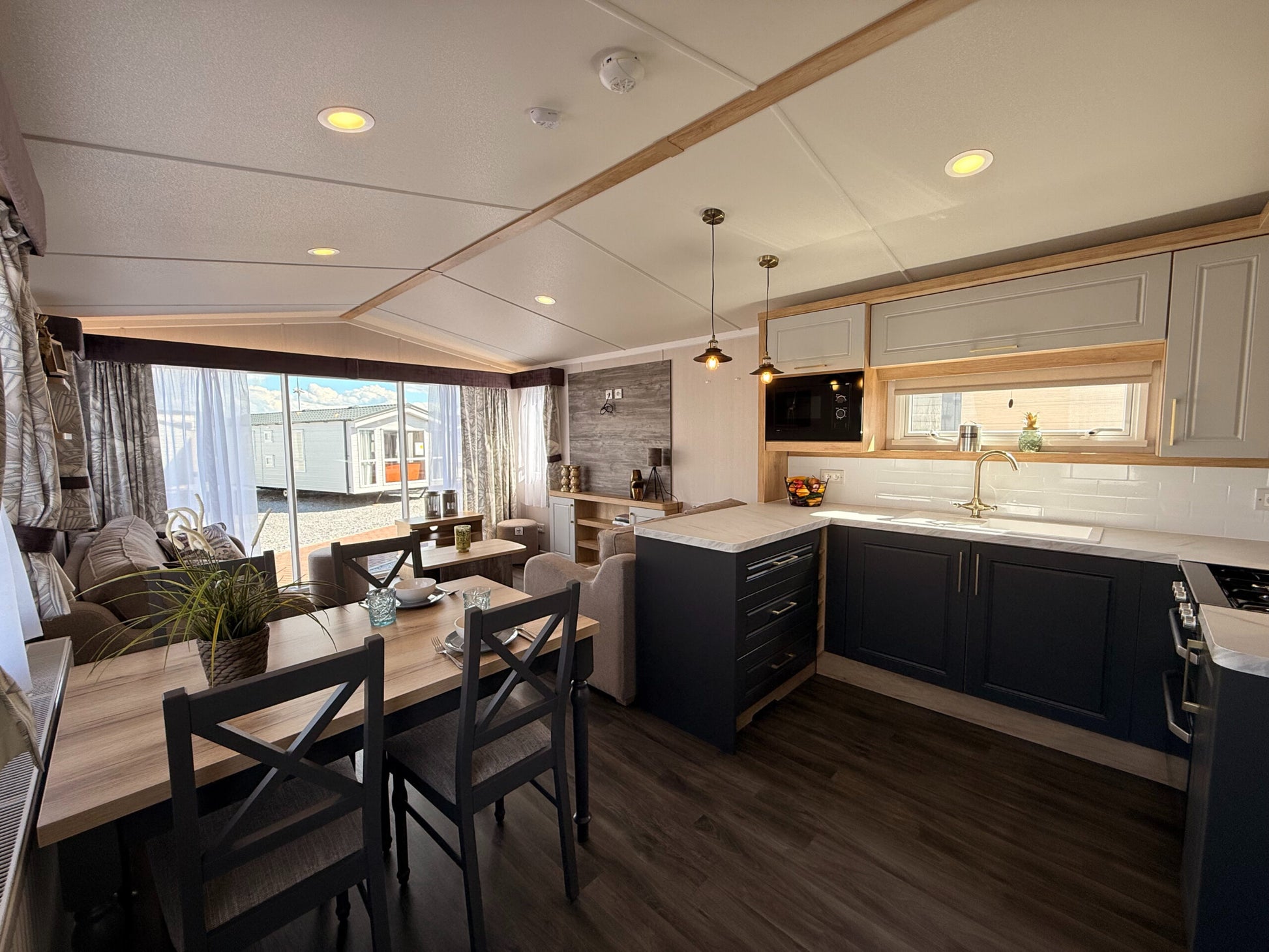 20250103 styl i komfort w jednym. to elegancki domek mobilny z przestronnym salonem pełnym światła i luksusową kuchnią w układzie „U”. Dwie komfortowe sypialnie, nowoczesna łazienka i pełne umeblowanie sprawiają, że to idealna przestrzeń na wakacje lub do zamieszkania na stałe w wyjątkowych warunkach.