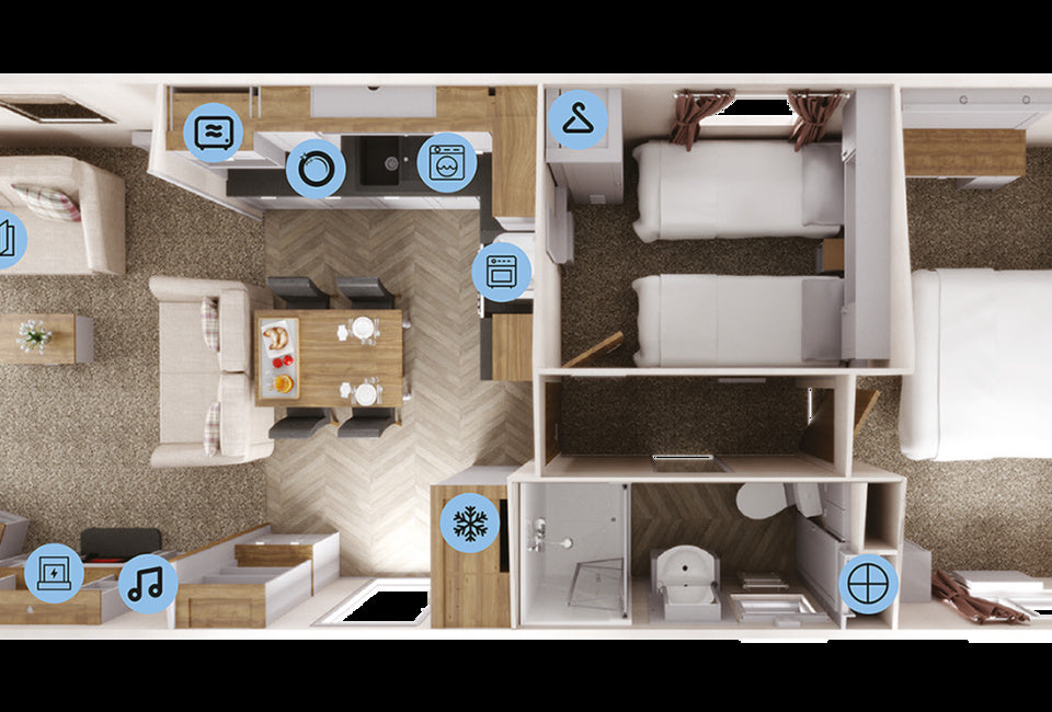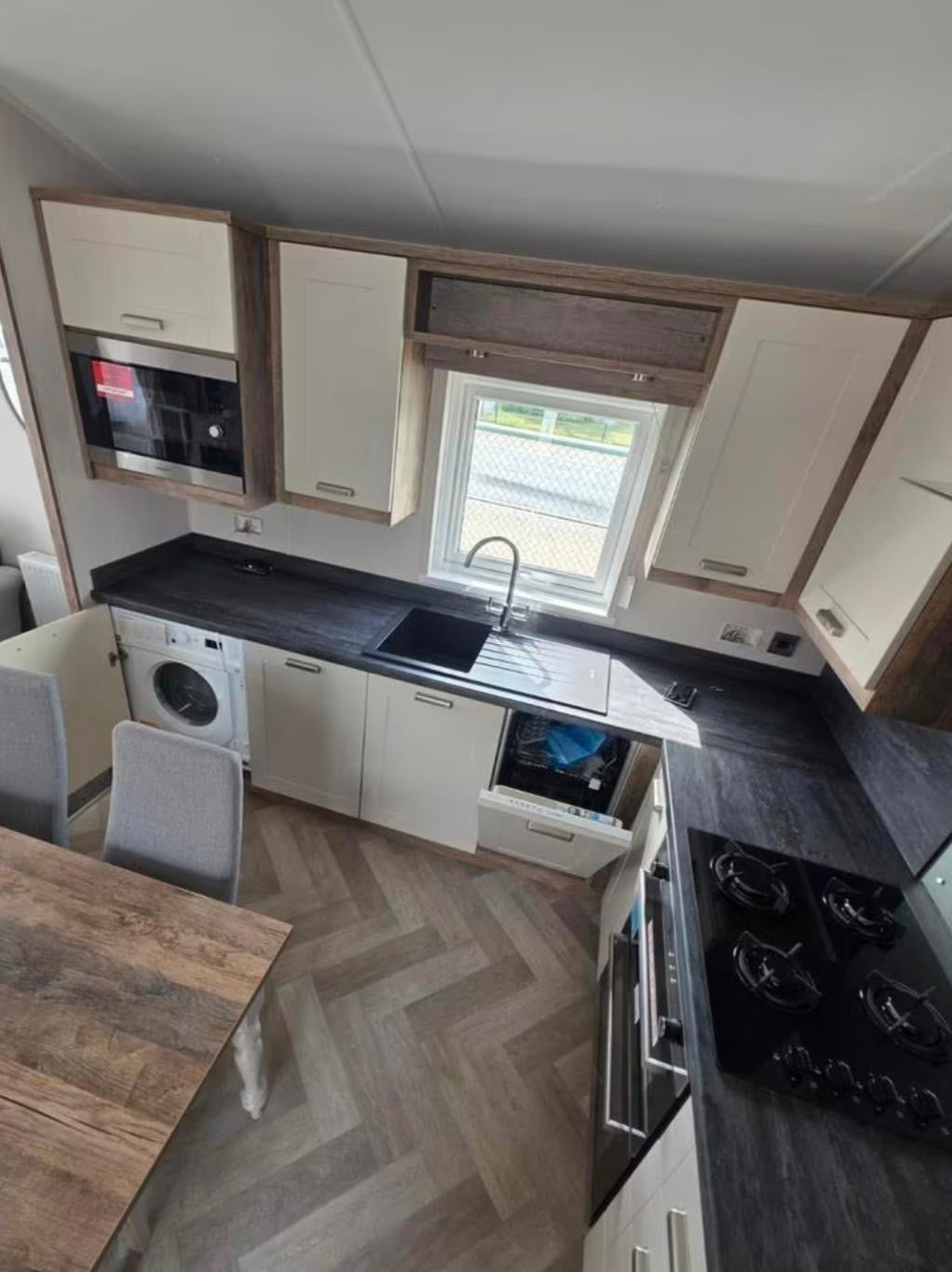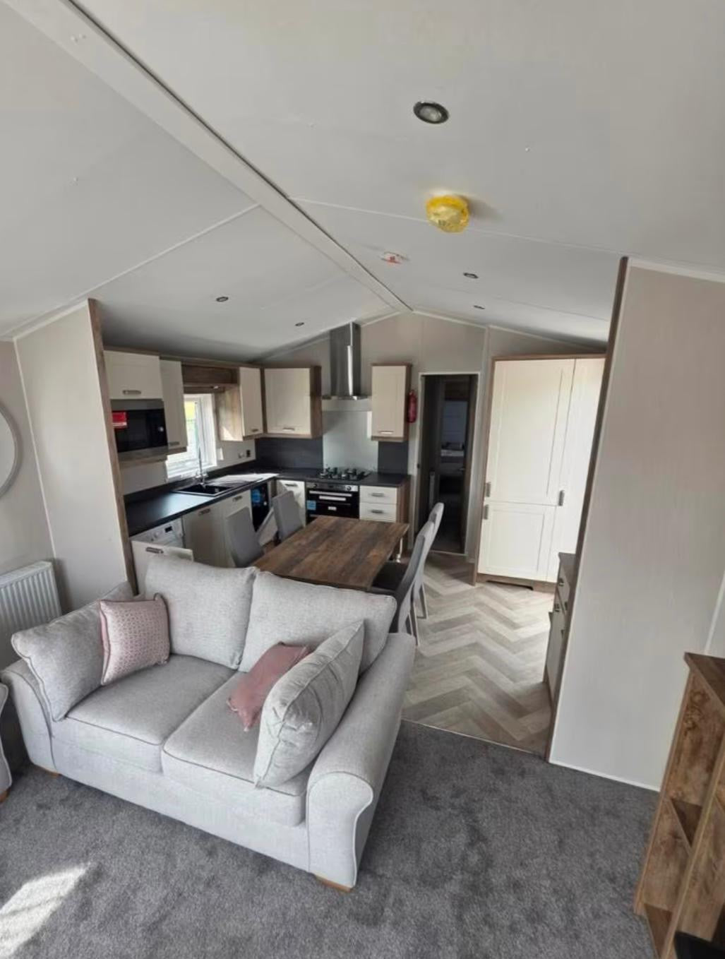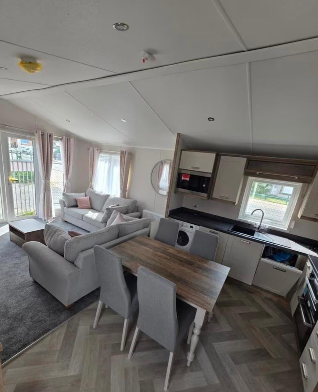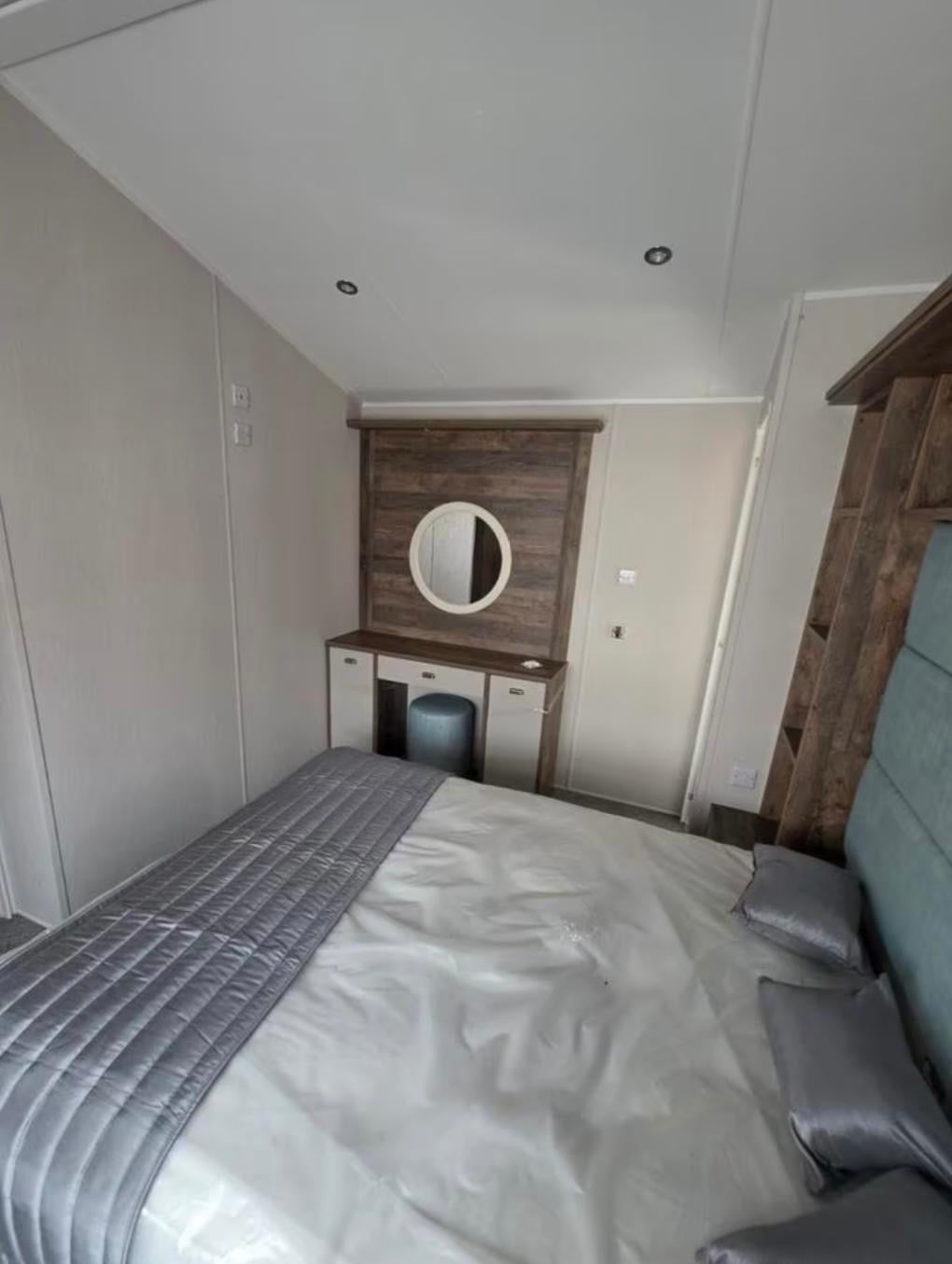 To luksusowy domek mobilny o powierzchni 12,5 × 4 m (ok. 50 m²), zaprojektowany zgodnie ze specyfikacją mieszkaniową BS3632, co gwarantuje całoroczne użytkowanie. Wyposażony w dwie przestronne sypialnie, dwie łazienki, nowoczesny salon i w pełni wyposażoną kuchnię, stanowi komfortowe i funkcjonalne rozwiązanie zarówno jako domek wakacyjny, jak i całoroczny dom mieszkalny