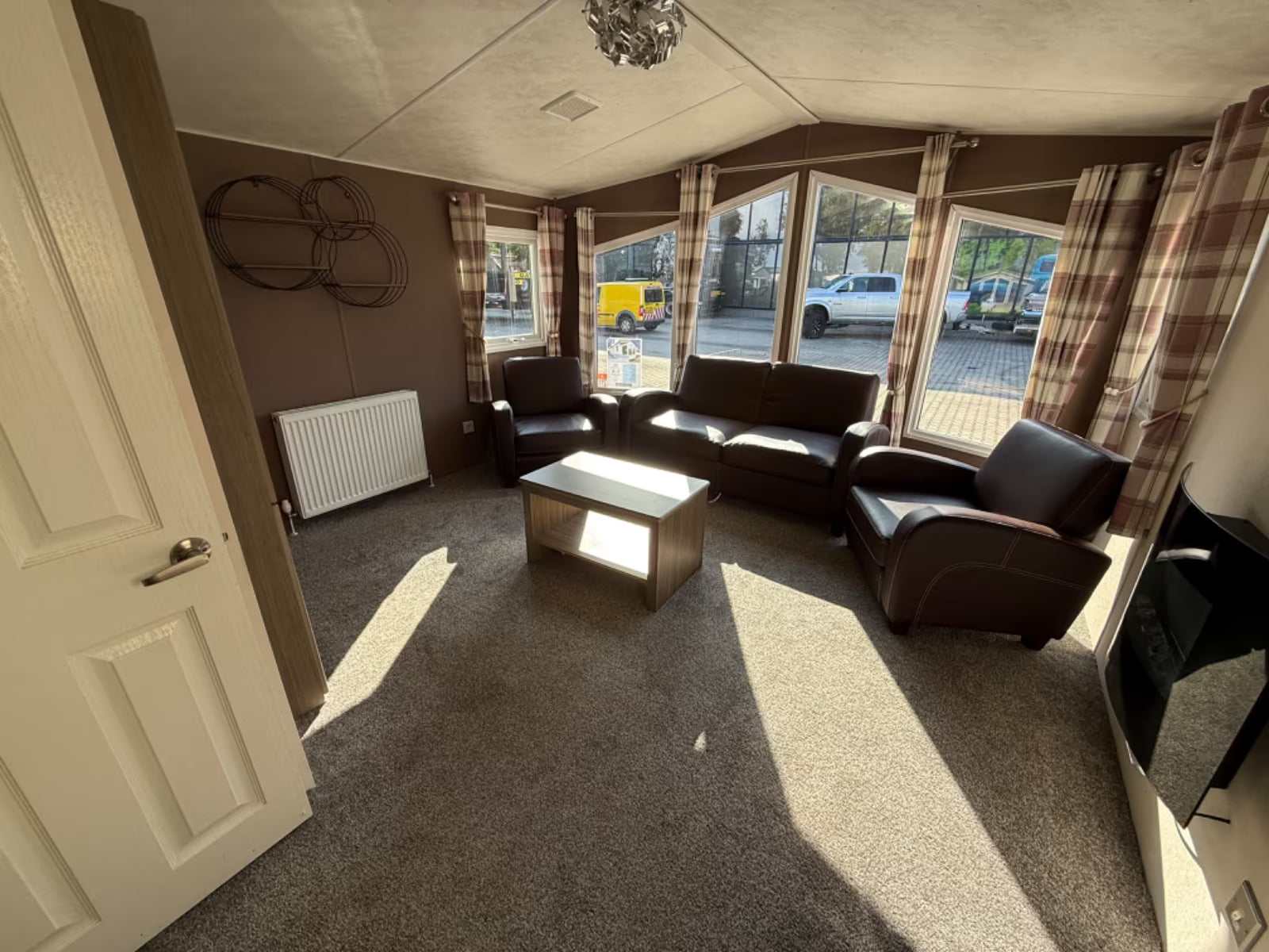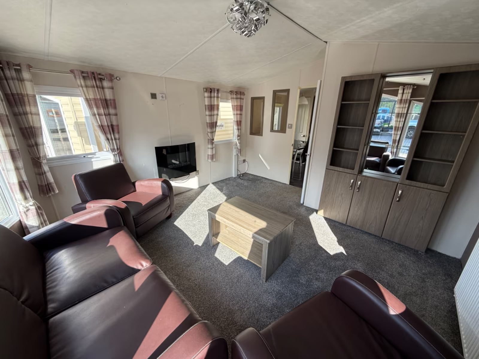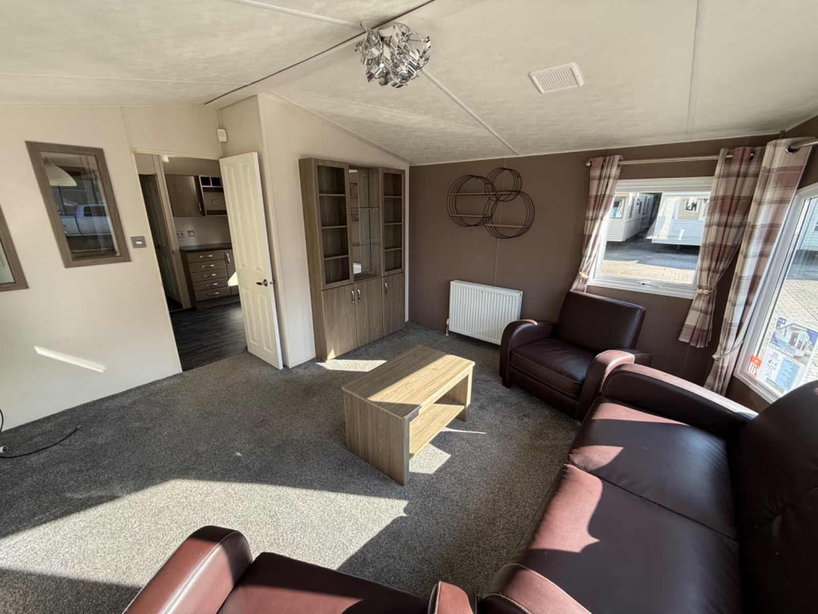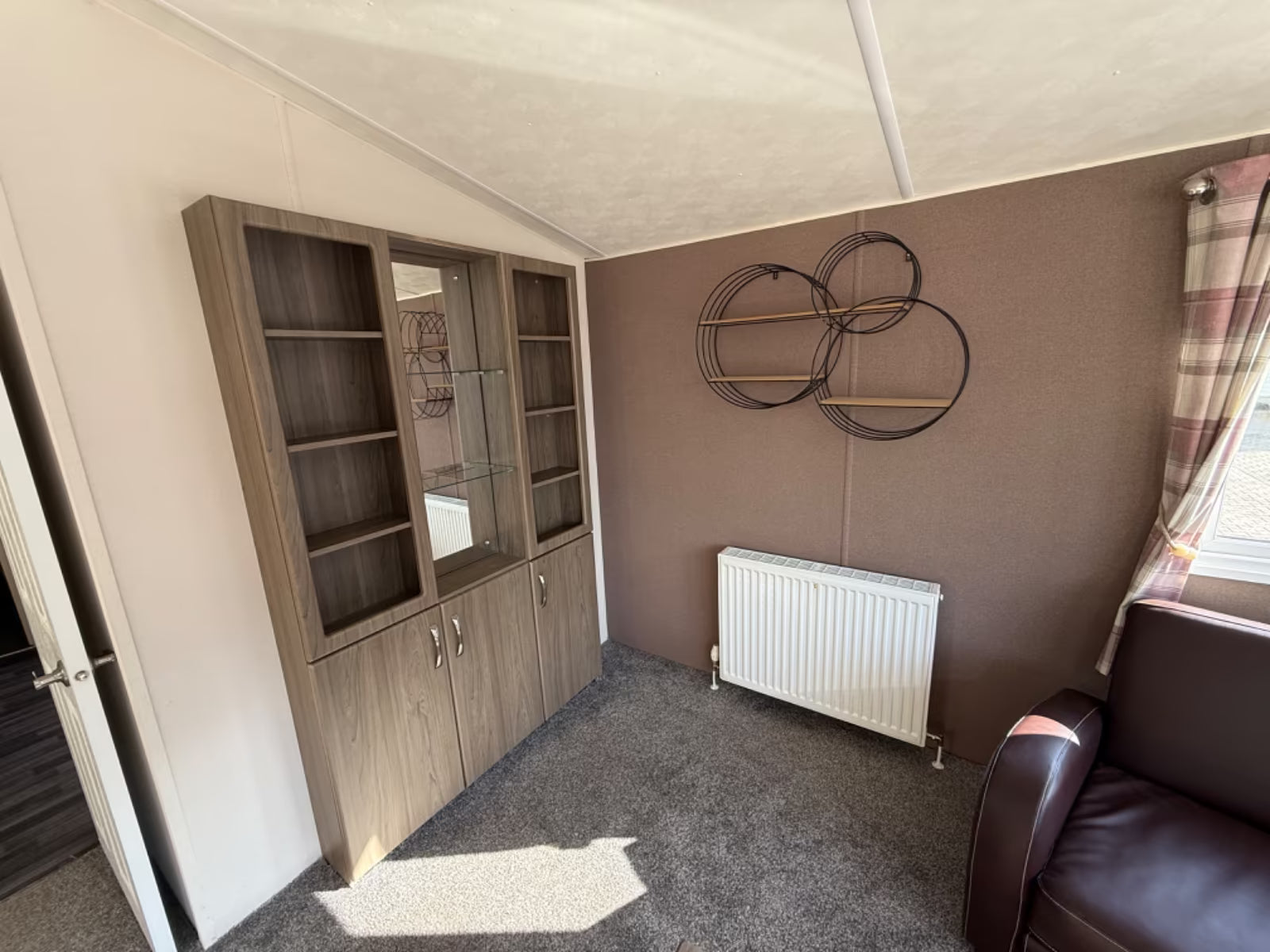 Salon wyposażony jest w dwuosobową sofę, fotel, stolik pod telewizor, różnego rodzaju miejsca do przechowywania oraz grzejnik.