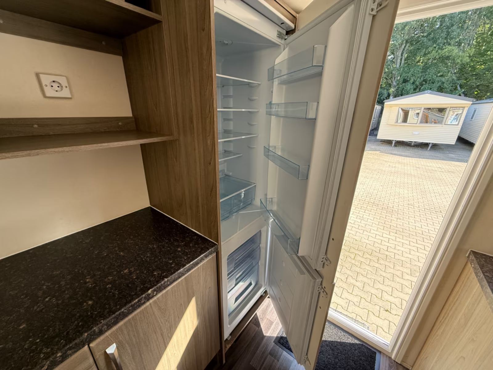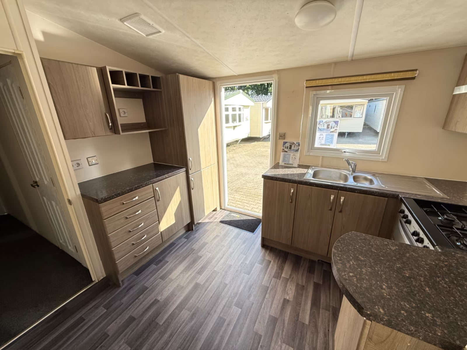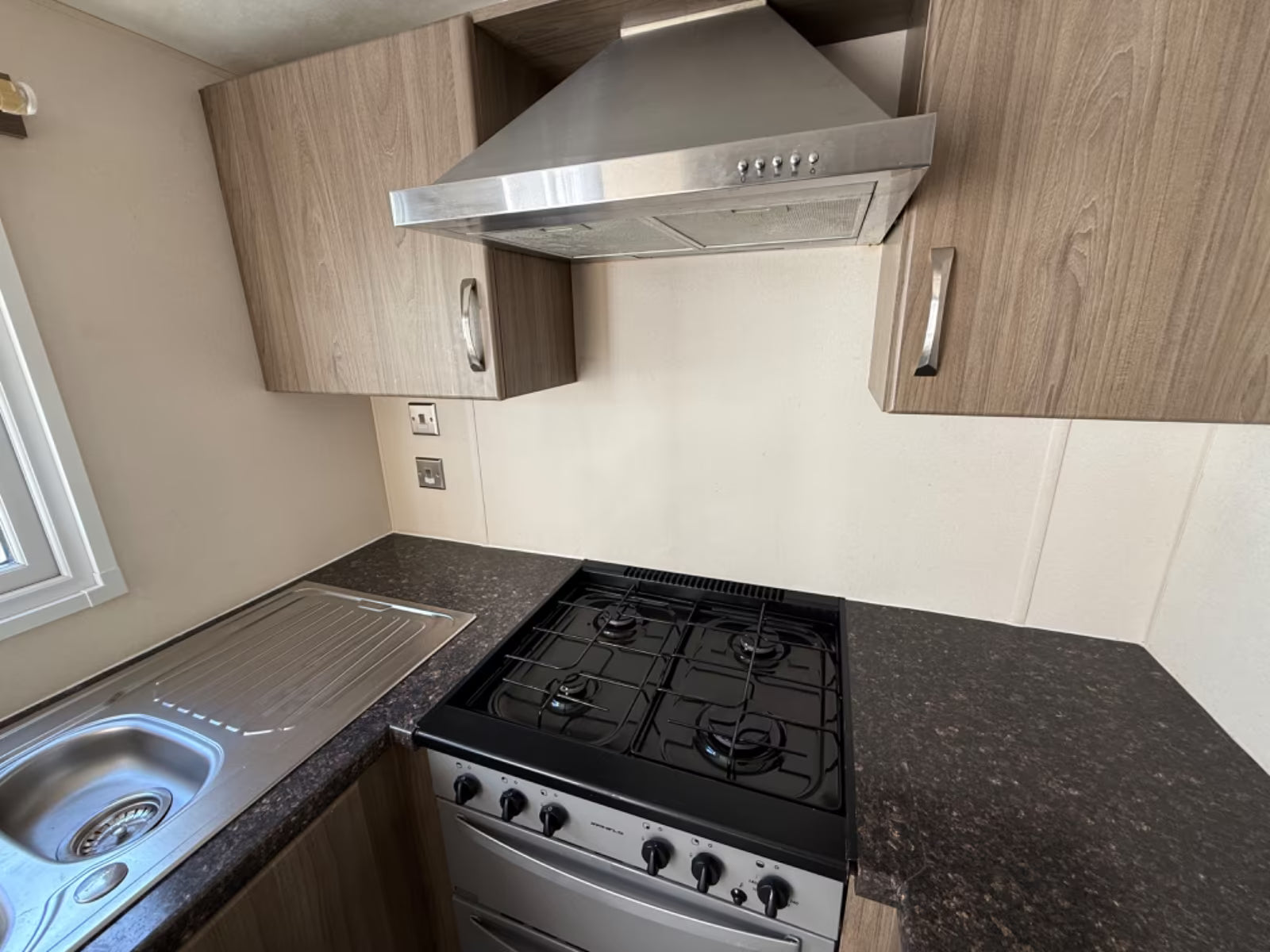 Kuchnia wyposażona jest w czteropalnikową kuchenkę gazową z okapem, piekarnikiem i grillem, a także lodówkę i zamrażarkę. Oferuje również dużo miejsca do przechowywania i blat roboczy.
