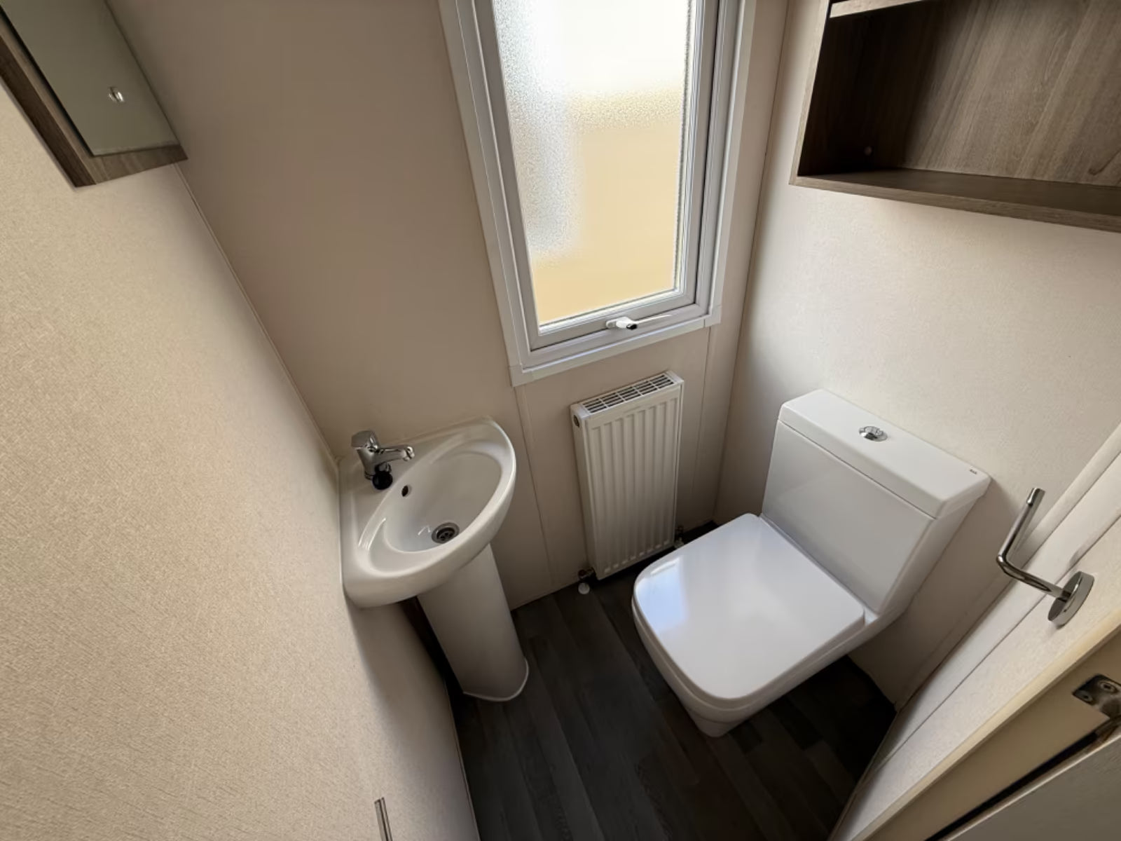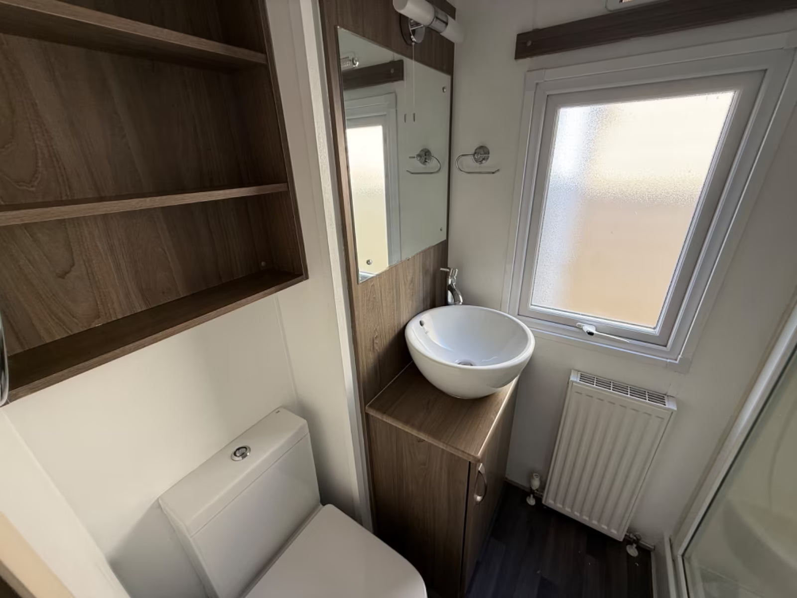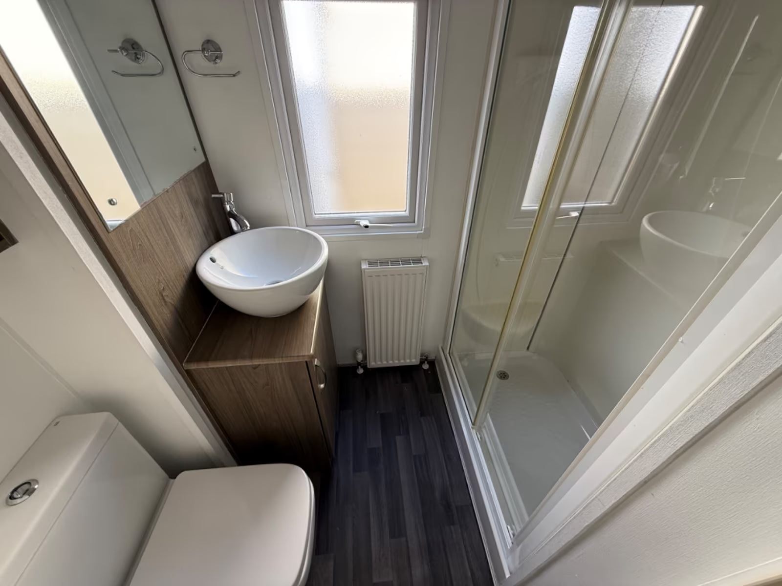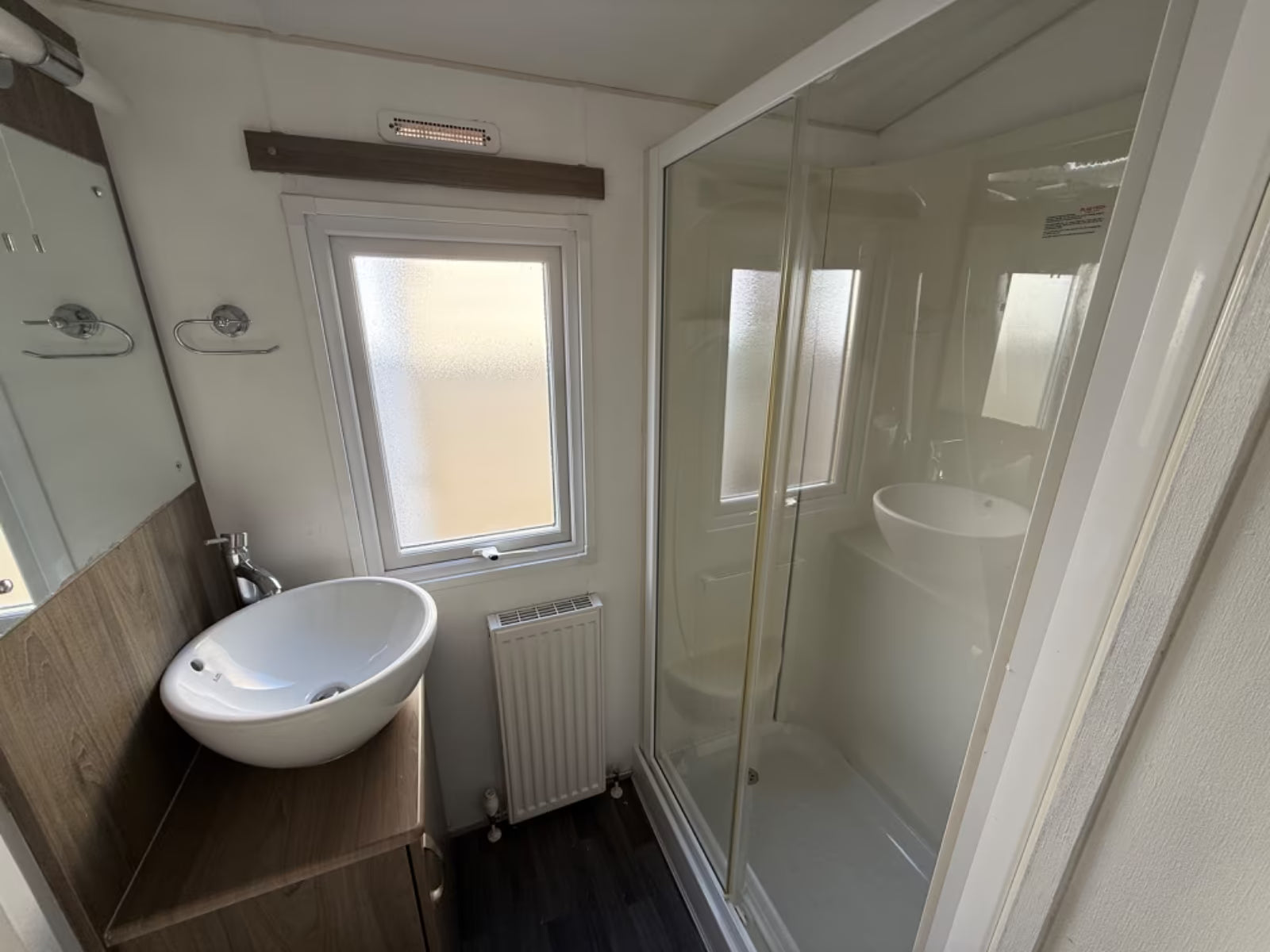 Łazienka wyposażona jest w prysznic, umywalkę i toaletę.