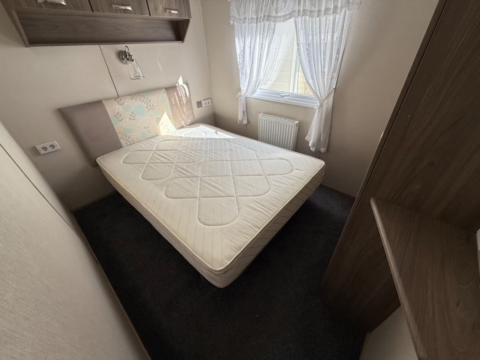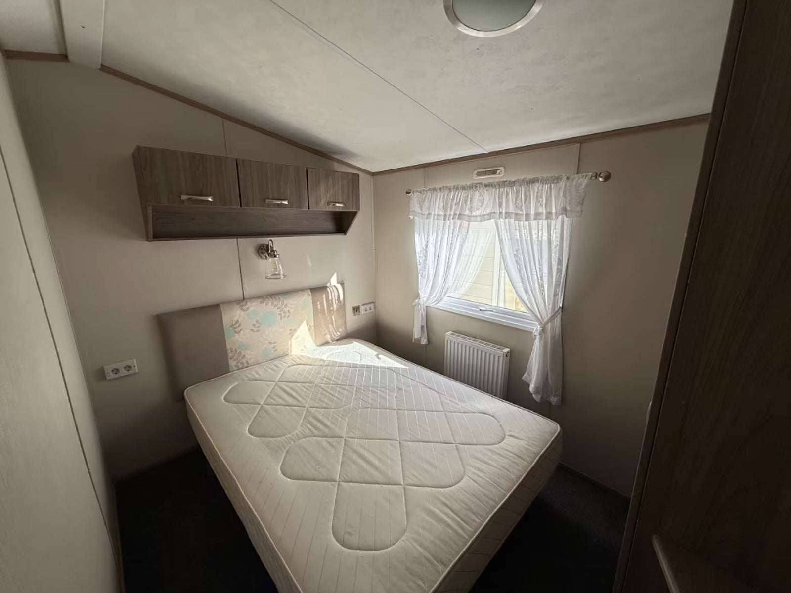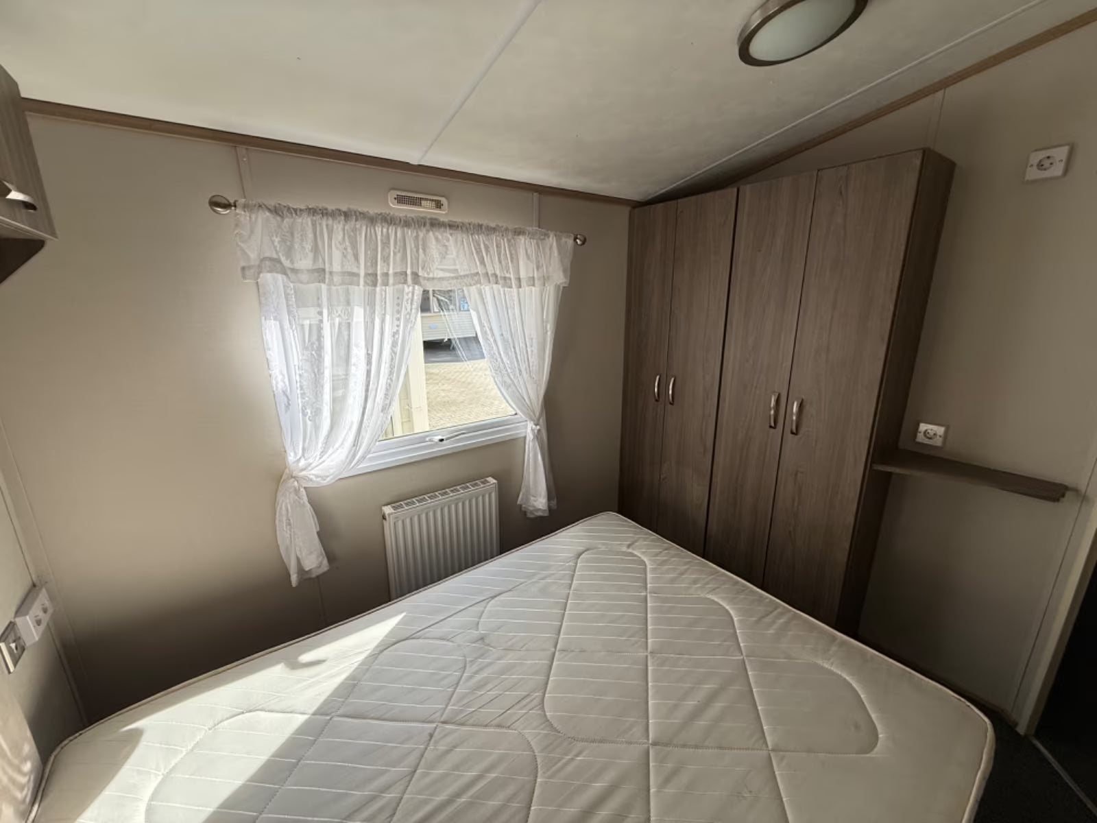 W pierwszej sypialni znajduje się łóżko podwójne, schowek nad głową i szafa.