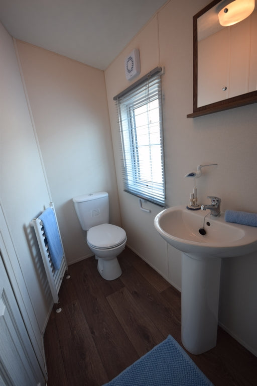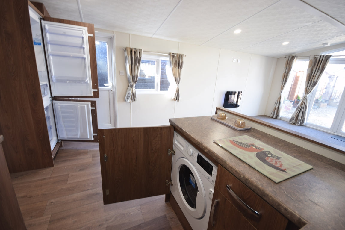 Wnętrze obejmuje nowoczesną, w pełni wyposażoną kuchnię i łazienki, z dużą zintegrowaną lodówko-zamrażarką oraz pralko-suszarką.