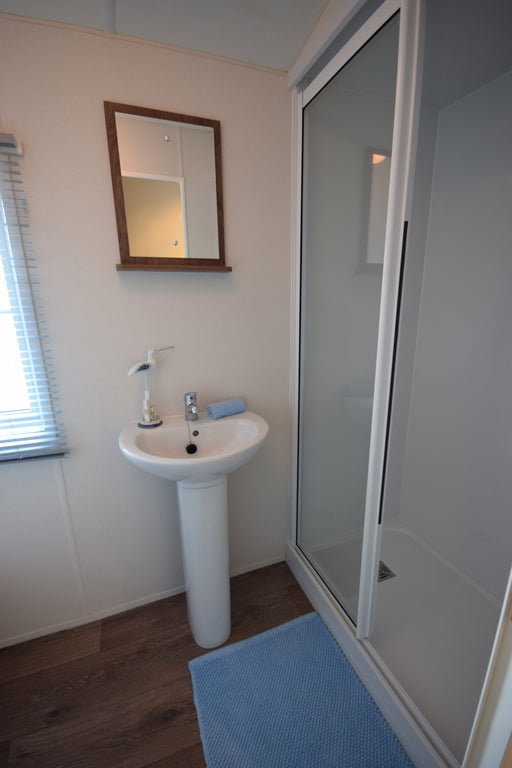 Przestronna łazienka została wyposażona w podwójną, całkowicie zabudowaną kabinę prysznicową, co podkreśla wysoki standard wykończenia.