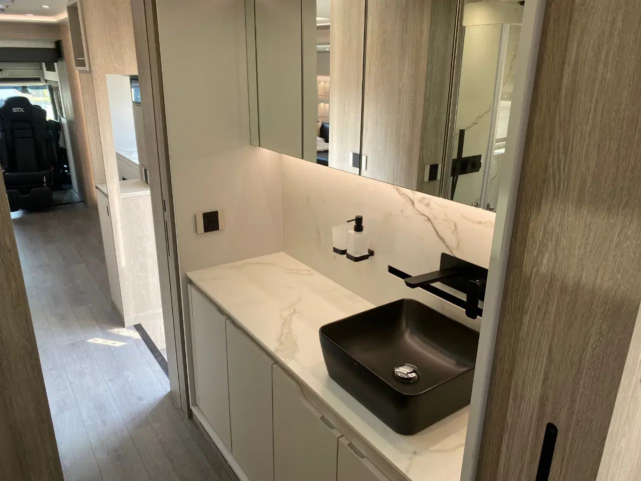 Dzięki 3 wysuwanym modułom (pop-outs) przestrzeń wewnętrzna kampera zmienia się w luksusowy apartament na kołach. Wnętrze wykończone czarną skórą zapewnia elegancję i wygodę, a inteligentny układ pomieszczeń gwarantuje pełną funkcjonalność podczas krótkich i długich podróży.
